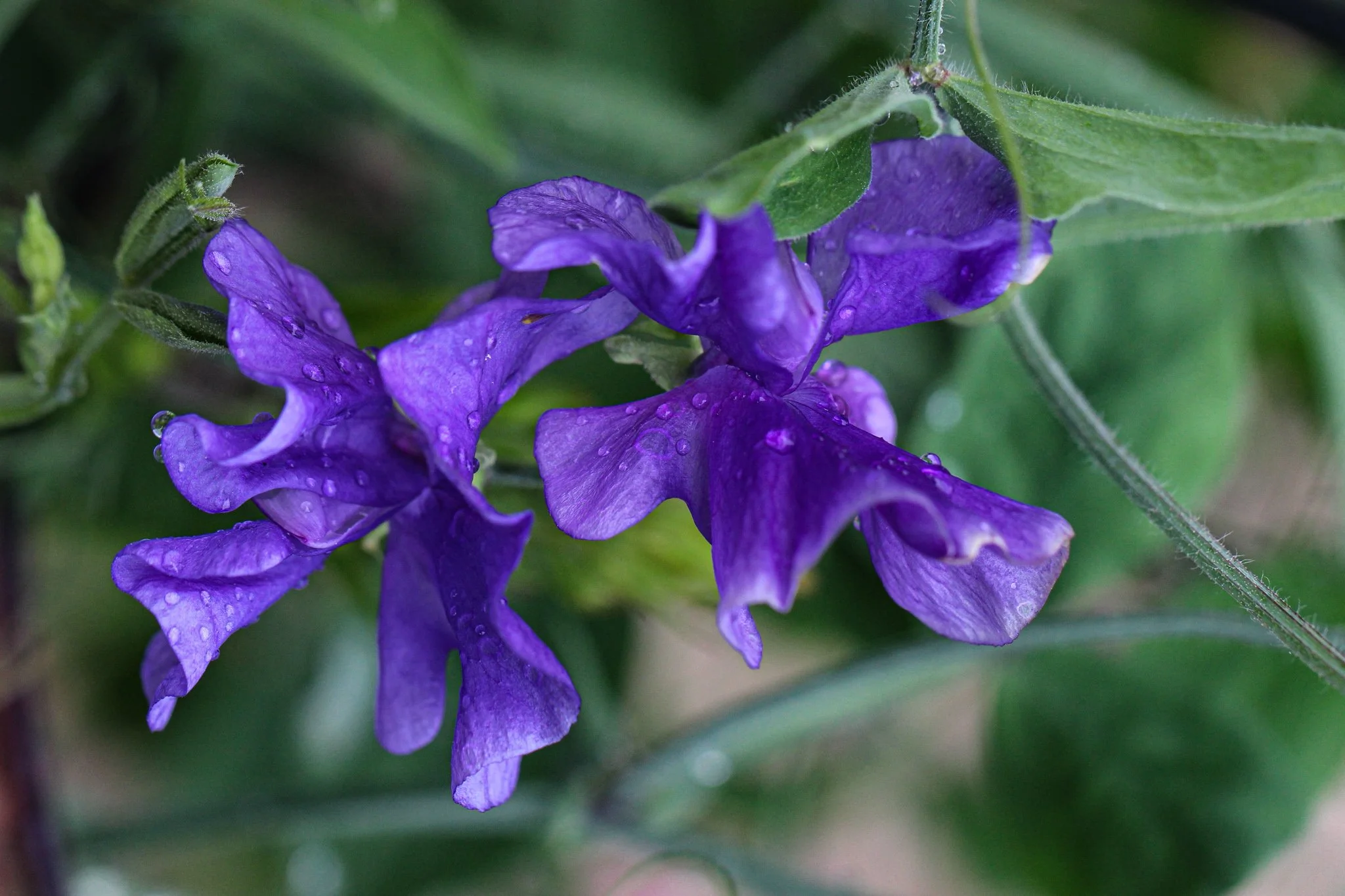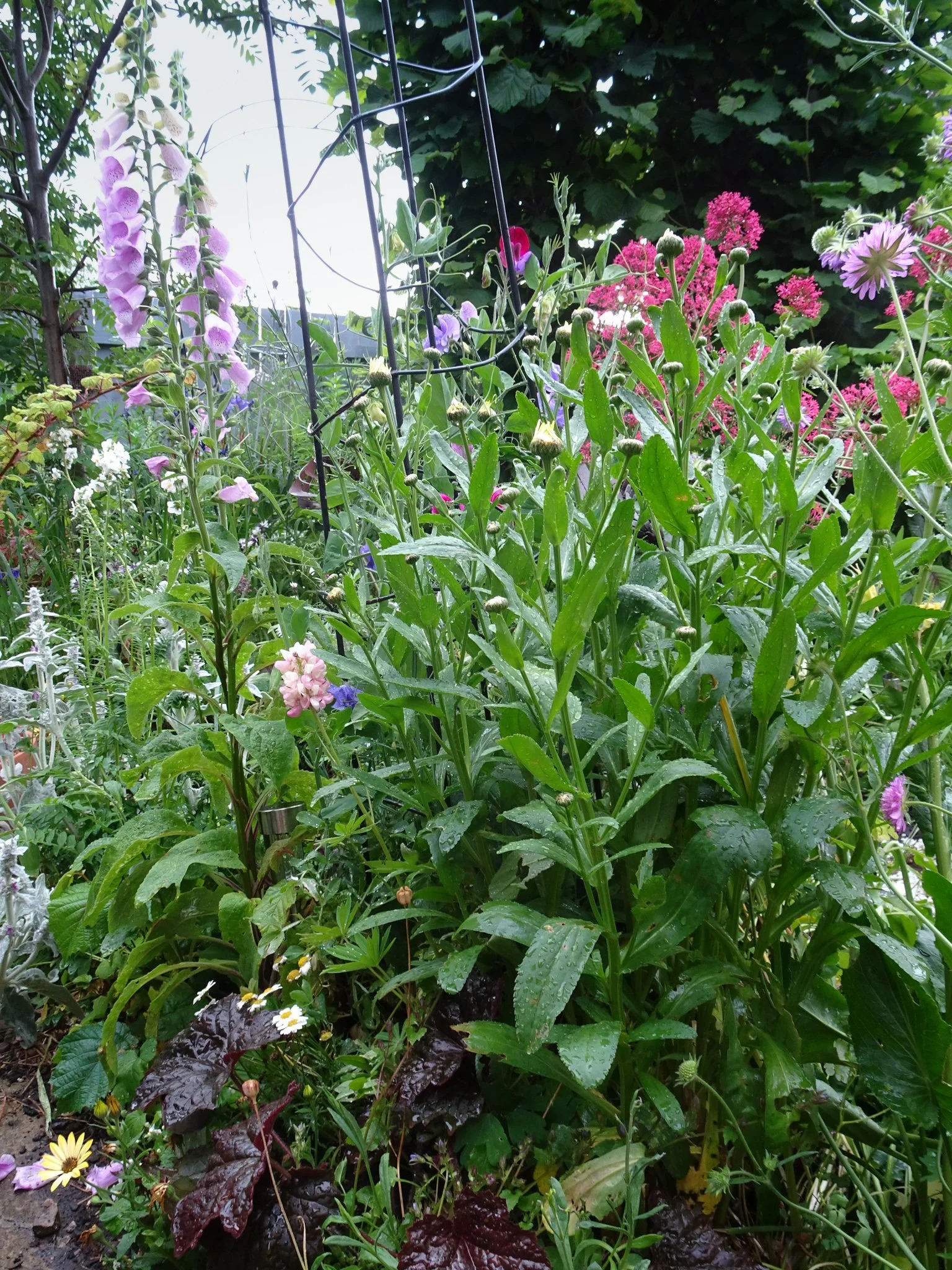More sweetpeas out and they are still mostly blue. Their scent is lovely but the flowers are getting lost in the mass of lush growth.