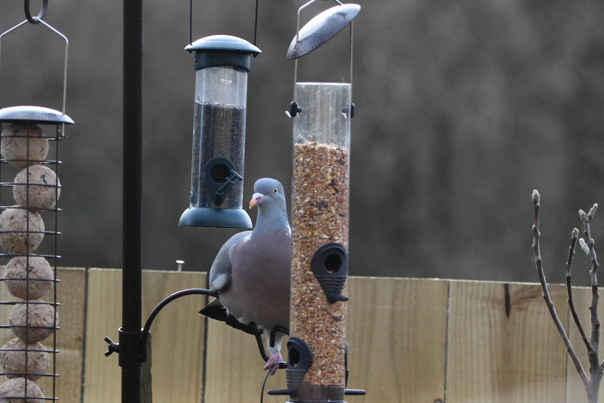 I have been pleased that the new bird-feeders have stayed in place despite the winds. I felt rewarded today when I looked up to see goldfinches along with the greedy pigeons.