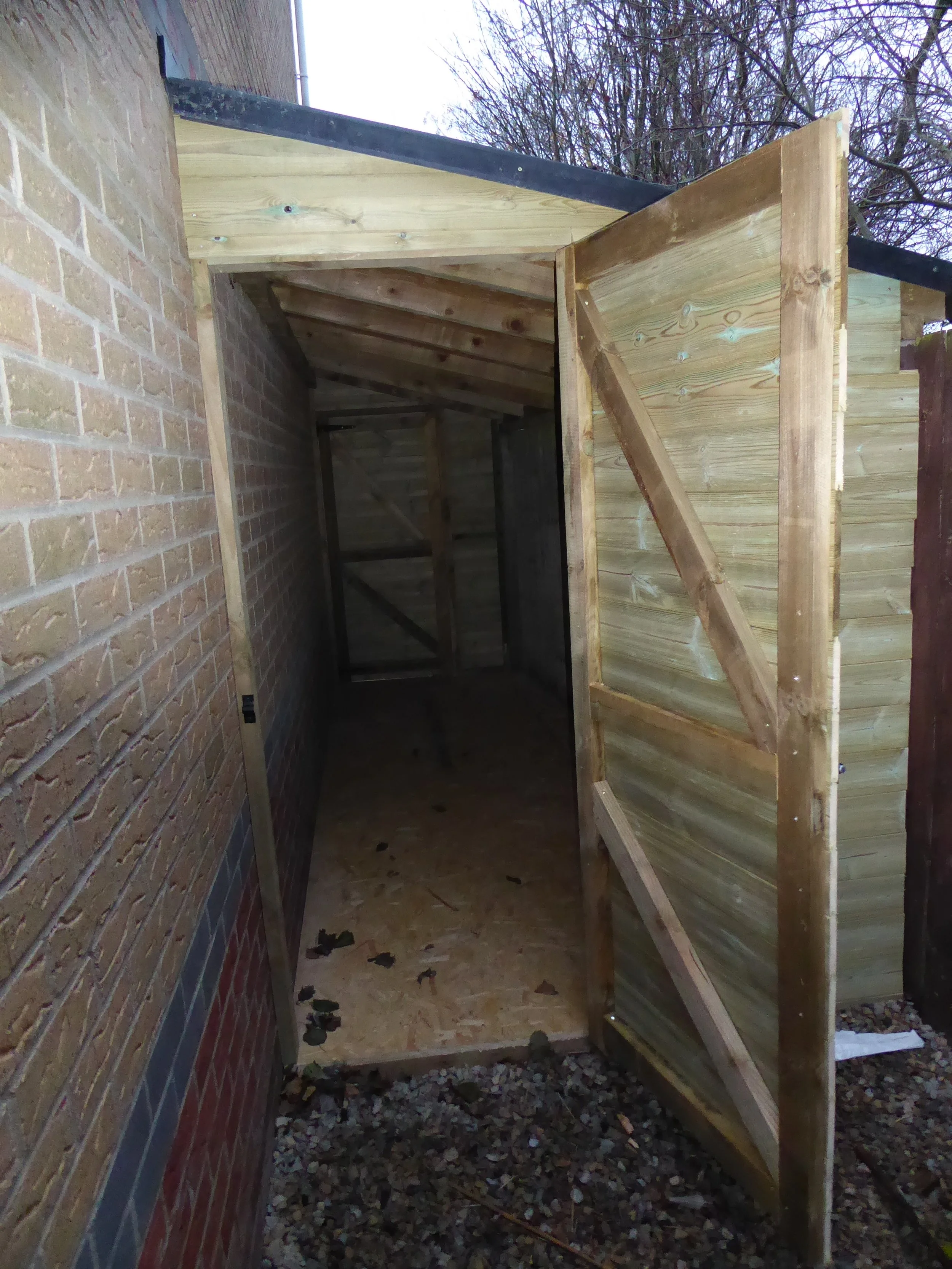 Another day where it seems to be dark for most of the time I’m not working! I’ve now got the bike out in the new shelter locked to its steel post and padlocks on either end of the shelter I’m really pleased with how this has worked out. The shelf will be used for the bike accessories including the helmet.