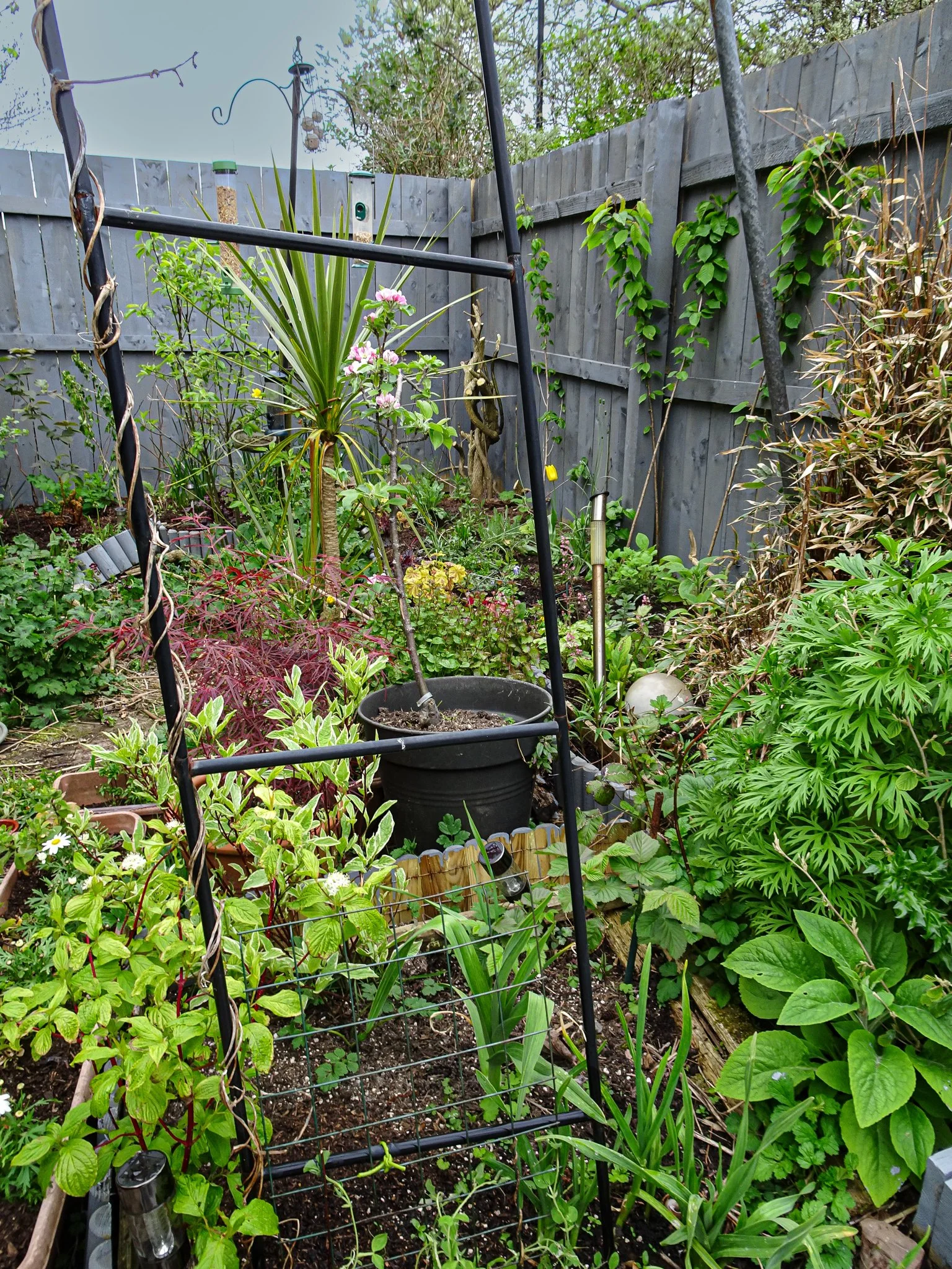 It was raining when I came back from work today but I still popped out for a few minutes. I love the way every time I walk round the garden there is something new to see and always something needing doing. Its garden waste bin day tomorrow so I’ve pulled the bin full of gooseberry clippings and dead wood round the front of the house. I’m pleased to see that the remains of the bush is still looking healthy and there is a tiny crop of gooseberries.