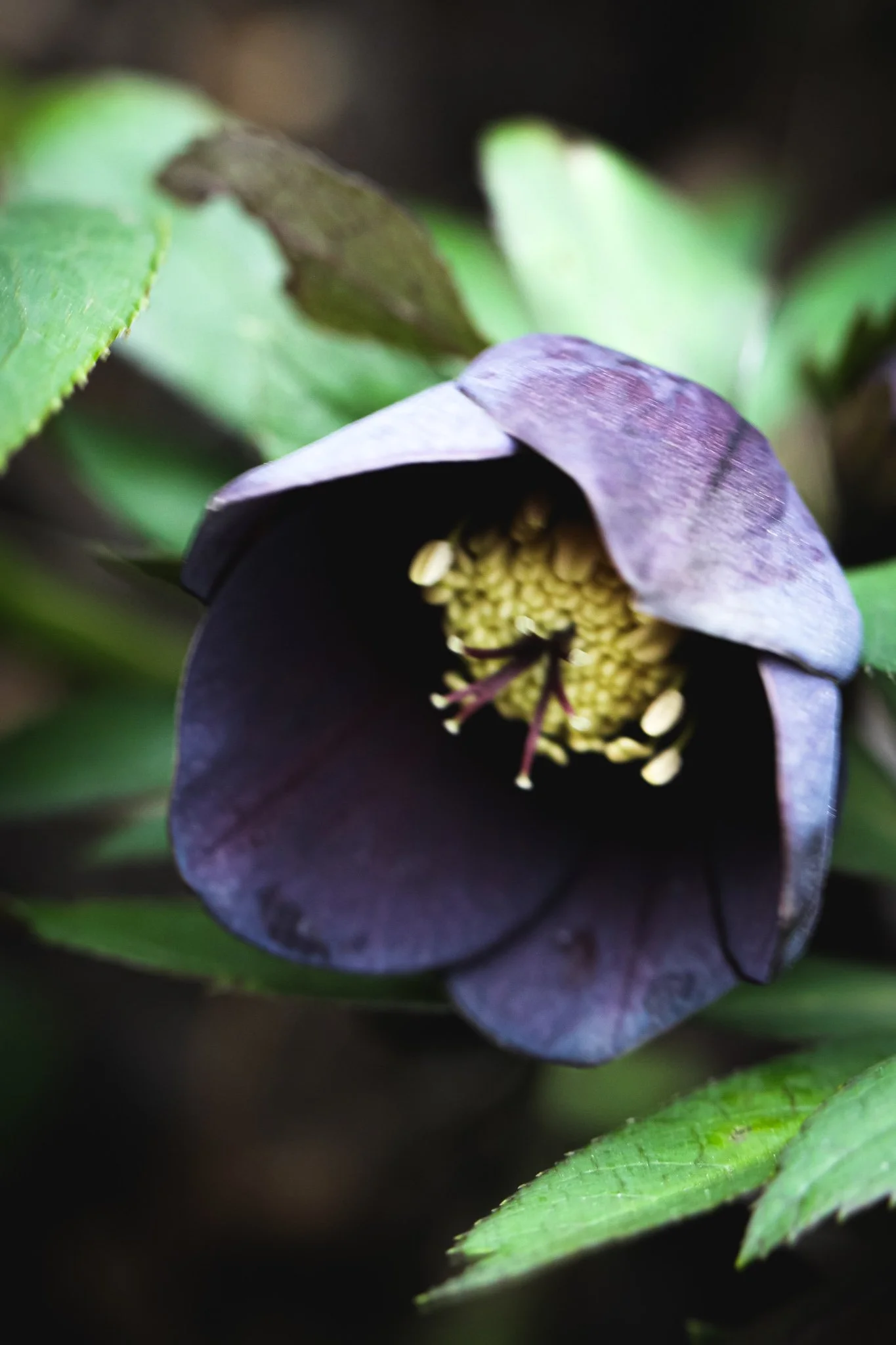 Hidden away under where the arbour seat had landed I found two wee hellebore so deeply purple that it looks black.