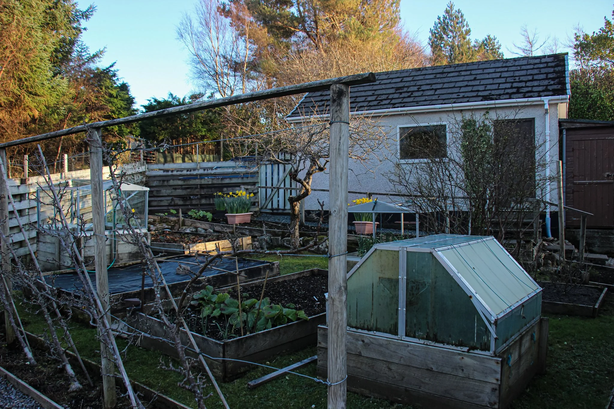 Round the side of the house & in front of the garage is the vegetable plot with its old plum tree and large blueberry bush. I’m always impressed how the large cold frames have survived the harshest of weather here.