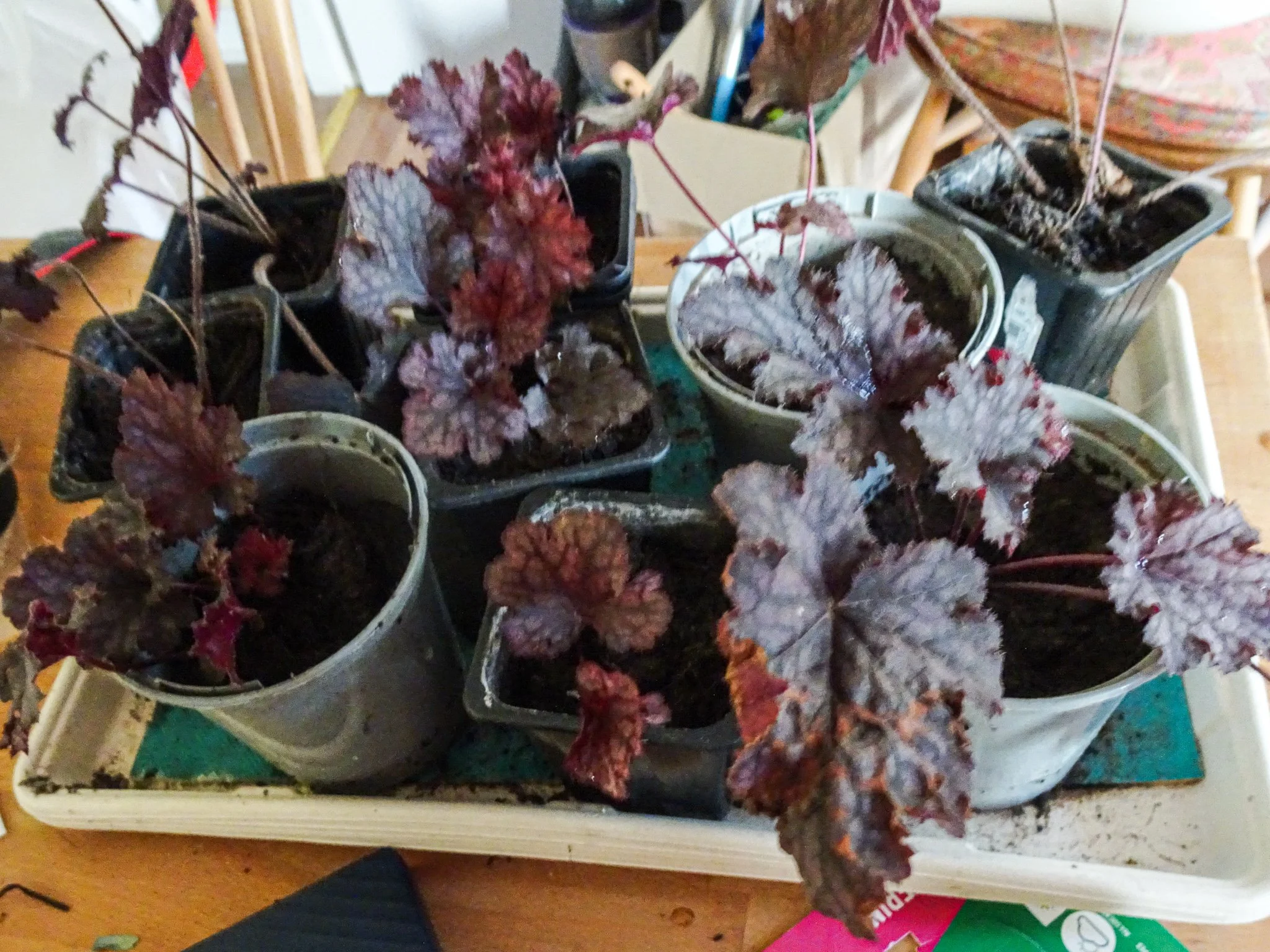 I took an old heuchera out from the front garden yesterday - Iām not sure which one it is but its a lovely dark leaf. I split it up into a whole set of new plantlets which will hopefully thrive now. This has worked well in the past and I plan to put two back in the from garden next spring having marked the spots where I want them to go.