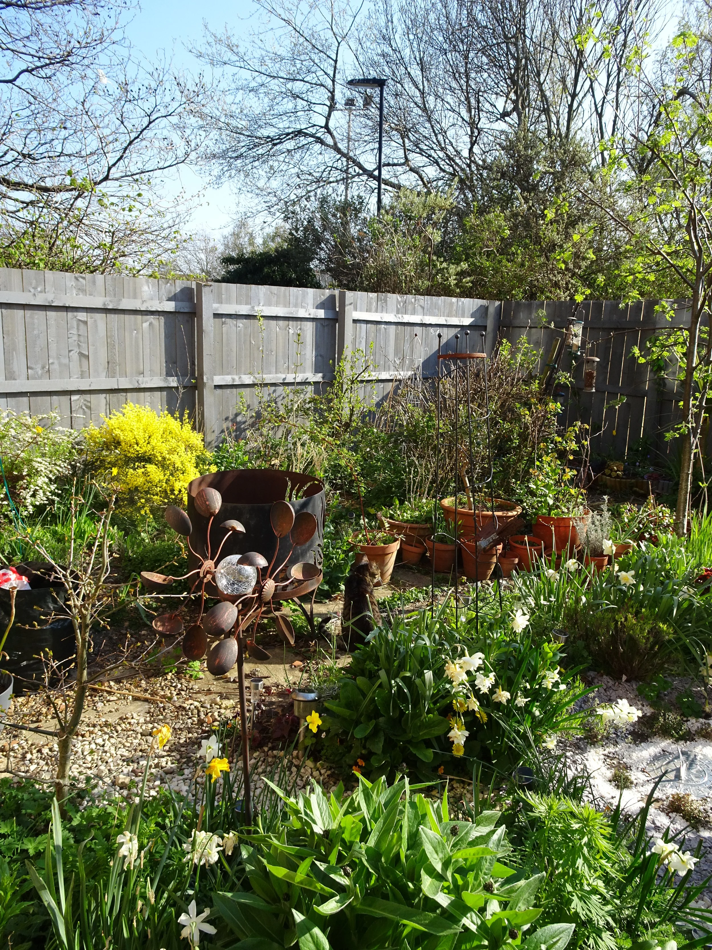 Today has been another beautiful day. I have painted a large chunk of fence so that there is about a panel & a half left, plus all the edging & the arbour seat. I then spent a long time talking to my brother on the phone sitting enjoying the sun and then just sitting. Sitting on the garden rocking chair I really enjoyed the scent of the broom from beyond the pond. Looking across the garden its bright yellow is beautiful against the grey fence.