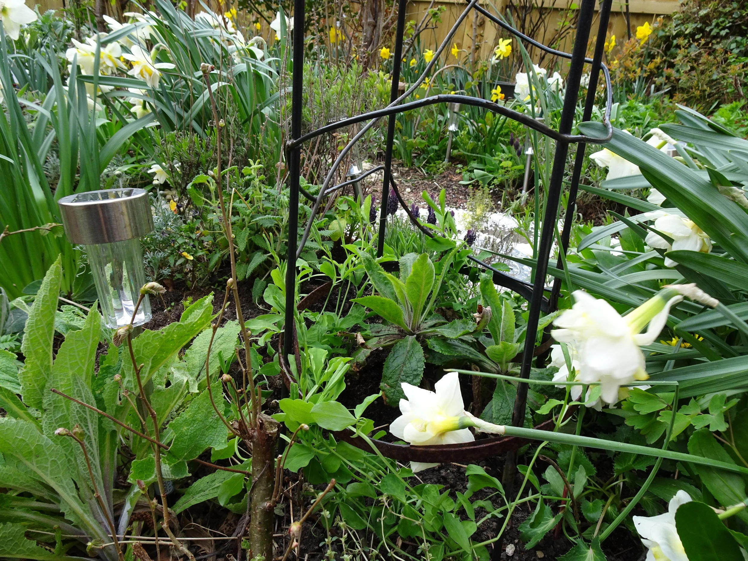 I was pleased to find that they had survived their first night and first gusts of wind, rather better than the white daffodils have done. There are three sorts I have planted out half of my Spencers mixed, a new one to me ‘Breath of fresh Air’ and a single colour ‘Blue Velvet’.