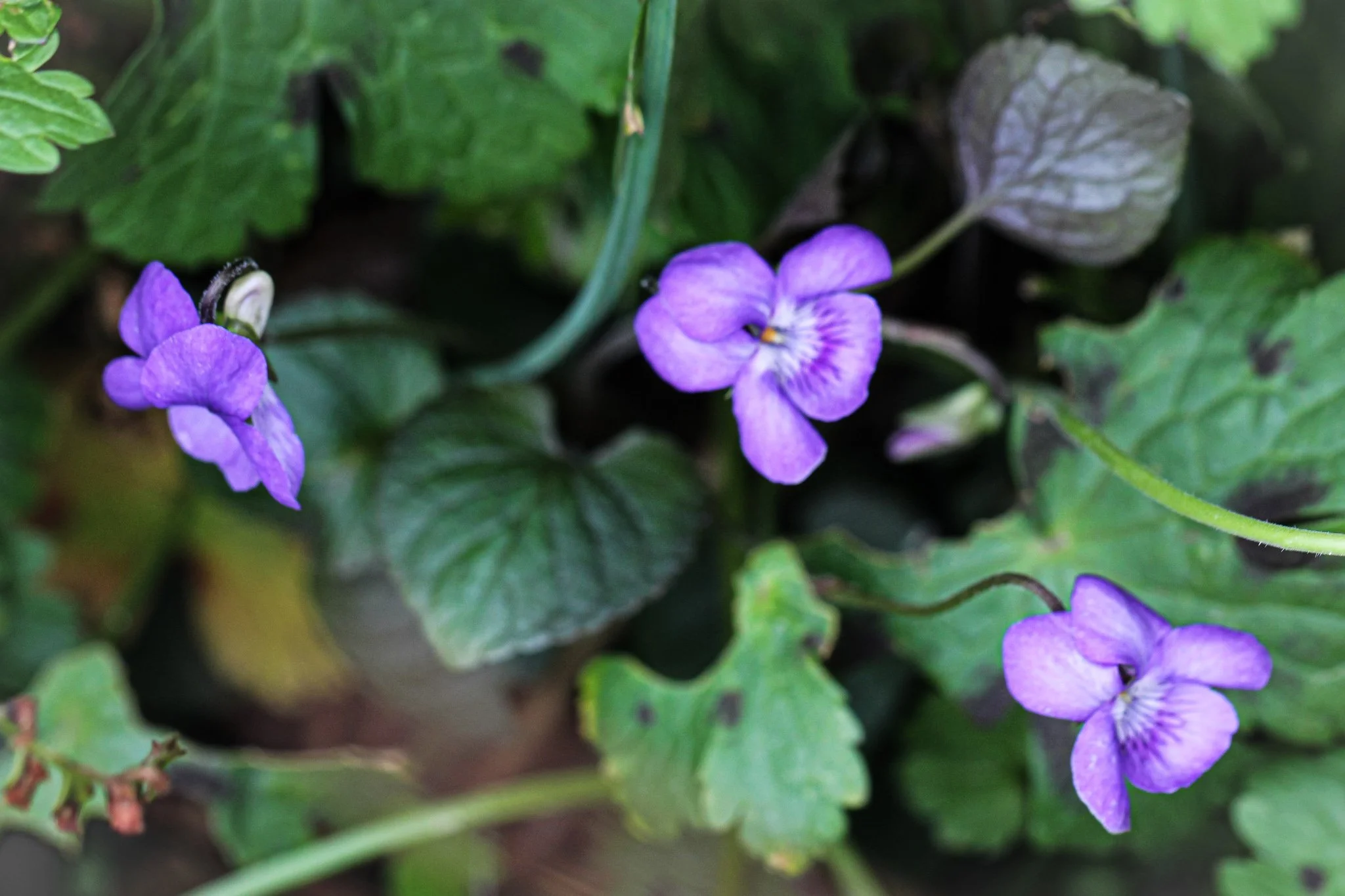 It is supposedly mild today but its felt chilly to me all day with the wind coming off the sea. Ben wasn’t that keen on being outside either. I caught a glimpse of blue below the wee blackcurrant bush next to the arbour seat and hiding amongst yet more dusky cranesbill were little sweet violets (Viola odorata)